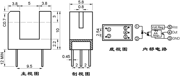 一、特点: ● 单光束施密特三极管集电极开路输出 ● 光缝宽度(分辨率):0.8mm;光轴中心:3mm。 ● IT156H 为通光高电平输出, IT156L 为通光低电平输出。