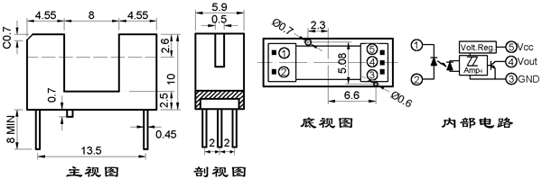 一、特点: ● 单光束施密特三极管集电极开路输出 ● 光缝宽度(分辨率):0.5mm;光轴中心:2.6mm。 ● IT180AH 为通光高电平输出, IT180AL 为通光低电平输出。